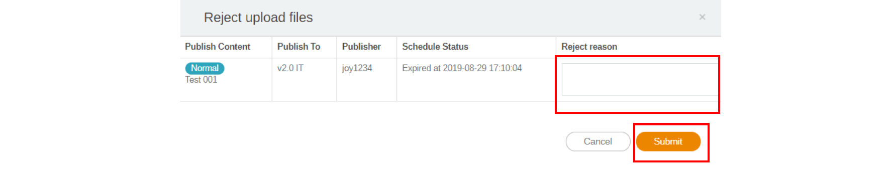 3. You need to fill in the reason you reject the file to be added to the schedule. This is a required field. Click Submit to proceed.