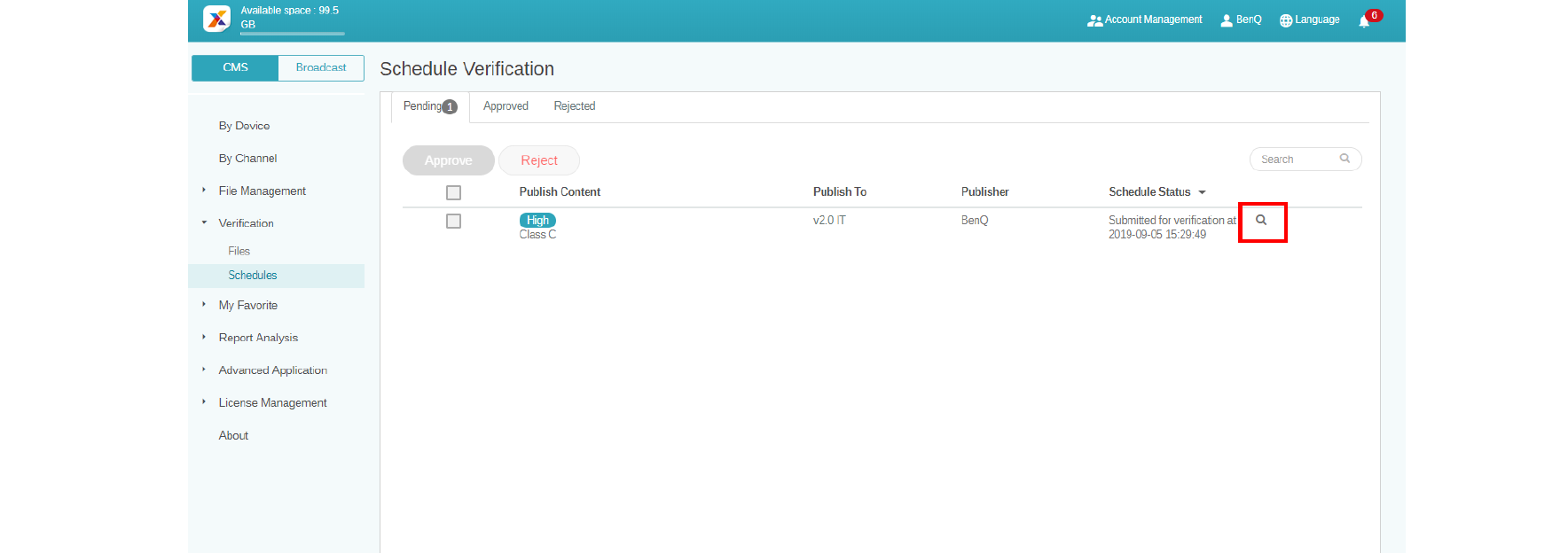 After a scheduled time is set, it has to be checked by the administrator. If the scheduled time is not appropriate, the administrator can reject the schedule. Only when the administrator clicks Approve can the file be played at the scheduled time on X-Sign Player.