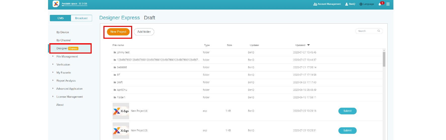 1. All the projects you create with Designer Express will store in the draft list. Media Library, which store the assets, can accelerate your design. Click New Project to go to the designer express template editing page.